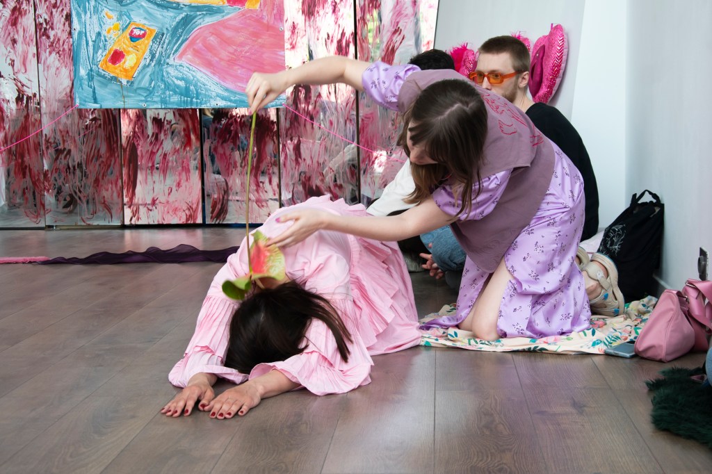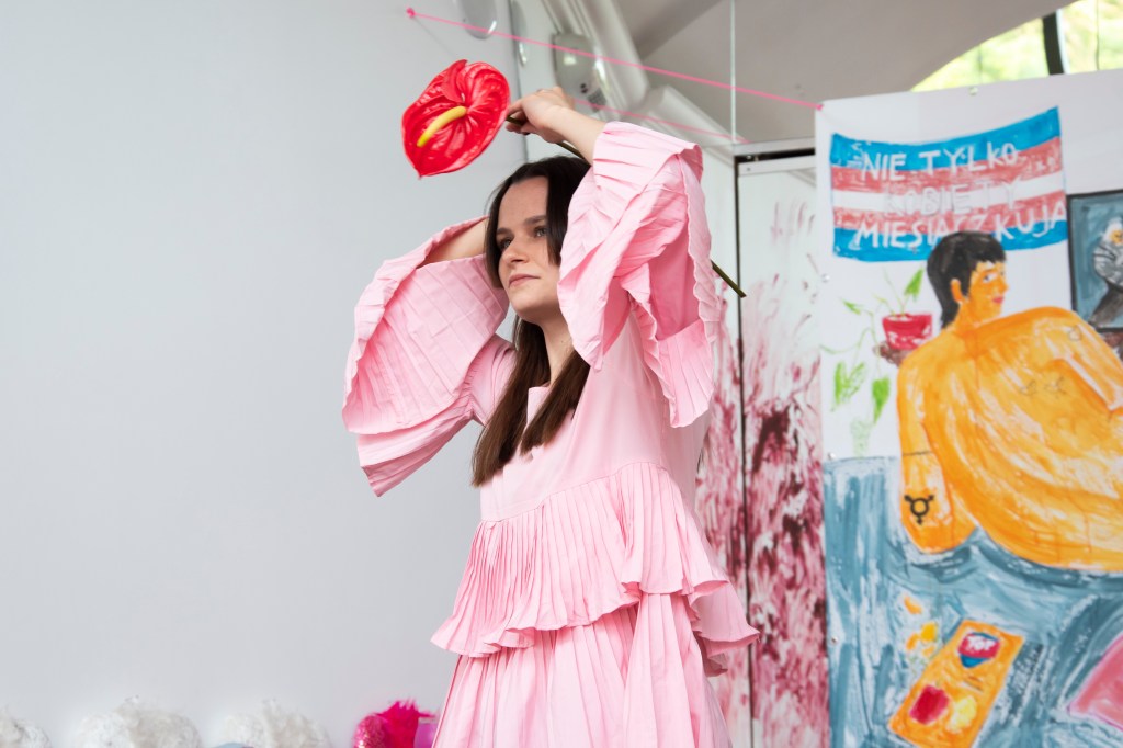 The work merges an intimate audio recording — a candid conversation between the artist and her girlfriend about menstruation — with a dance involving strange, erotically charged anthurium flowers, those glossy blooms so often seen in Catholic churches.